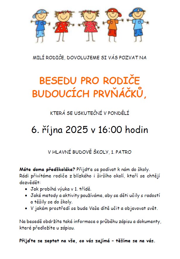 Milí rodiče, dovolujeme si Vás pozvat na „Besedu pro rodiče budoucích prvňáčků“, která se uskuteční v pondělí 6. října 2025 v 16:00 hodin v hlavní budově školy, 1. patro.