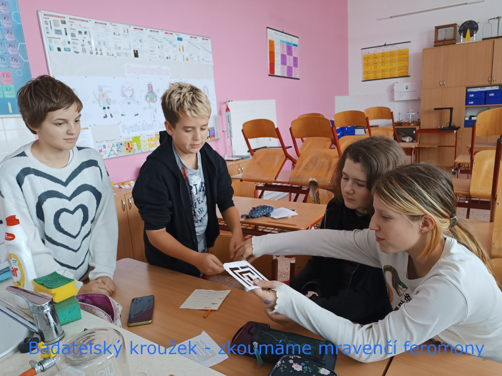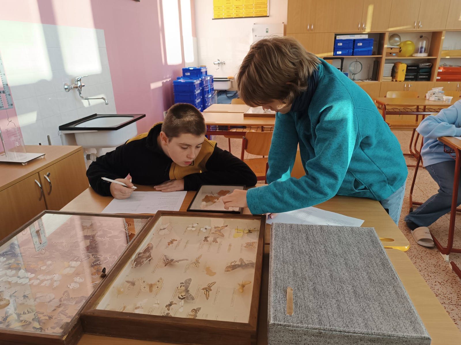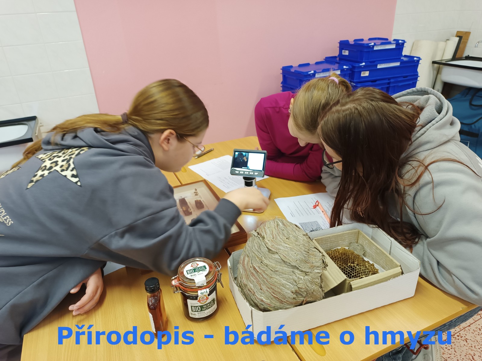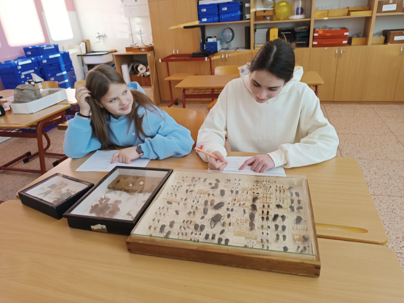 V přírodopise a zájmových kroužcích se žáci věnovali seismografickým datům 📈, pitvali ryby 🐟 a zkoumali hmyz 🐞.