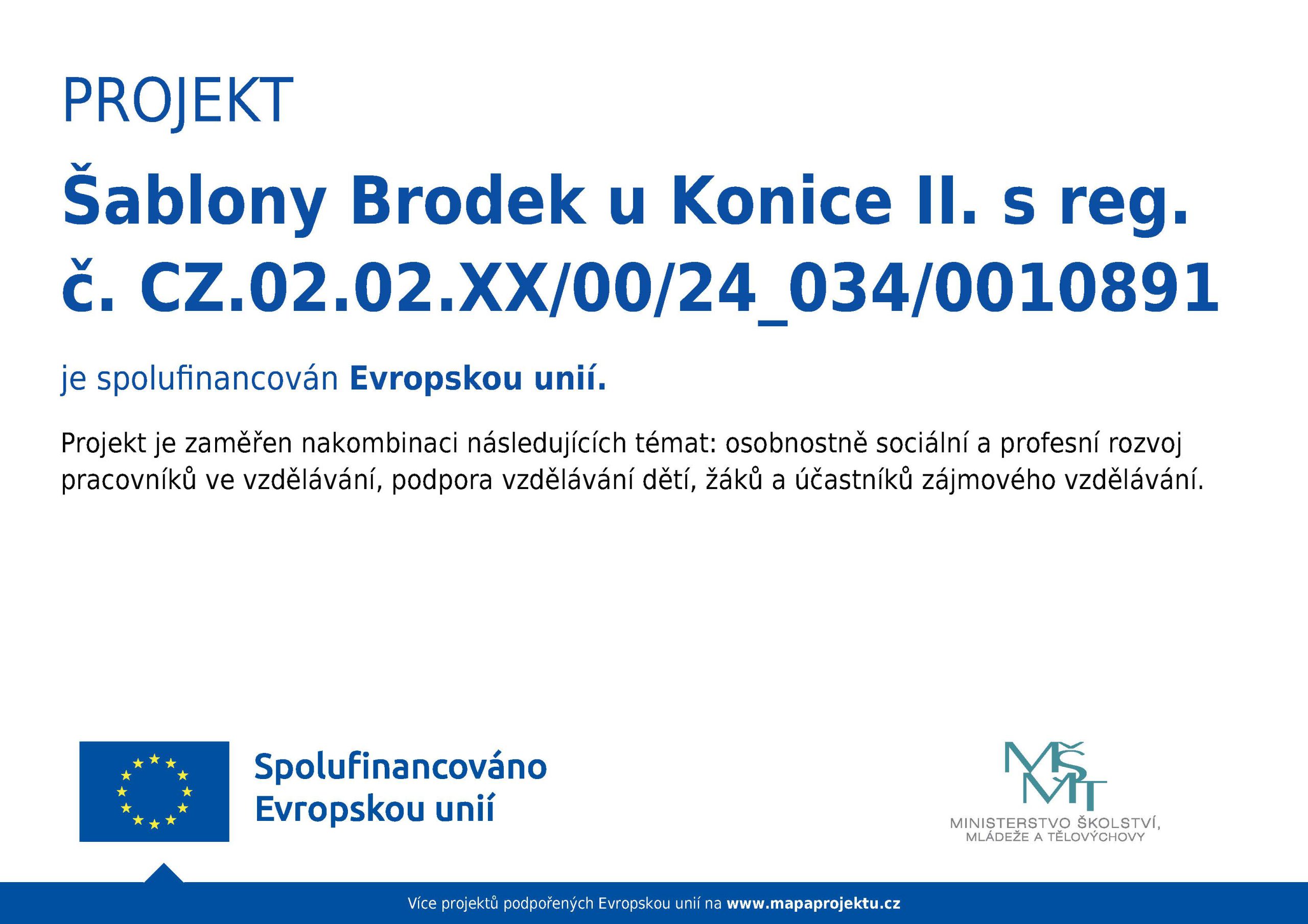 Projekt OP JAK Šablony Brodek u Konice II (2024 – 2027) je zaměřen na kombinaci následujících témat: osobnostně sociální a profesní rozvoj pracovníků ve vzdělávání, podpora vzdělávání dětí, žáků a účastníků zájmového vzdělávání.